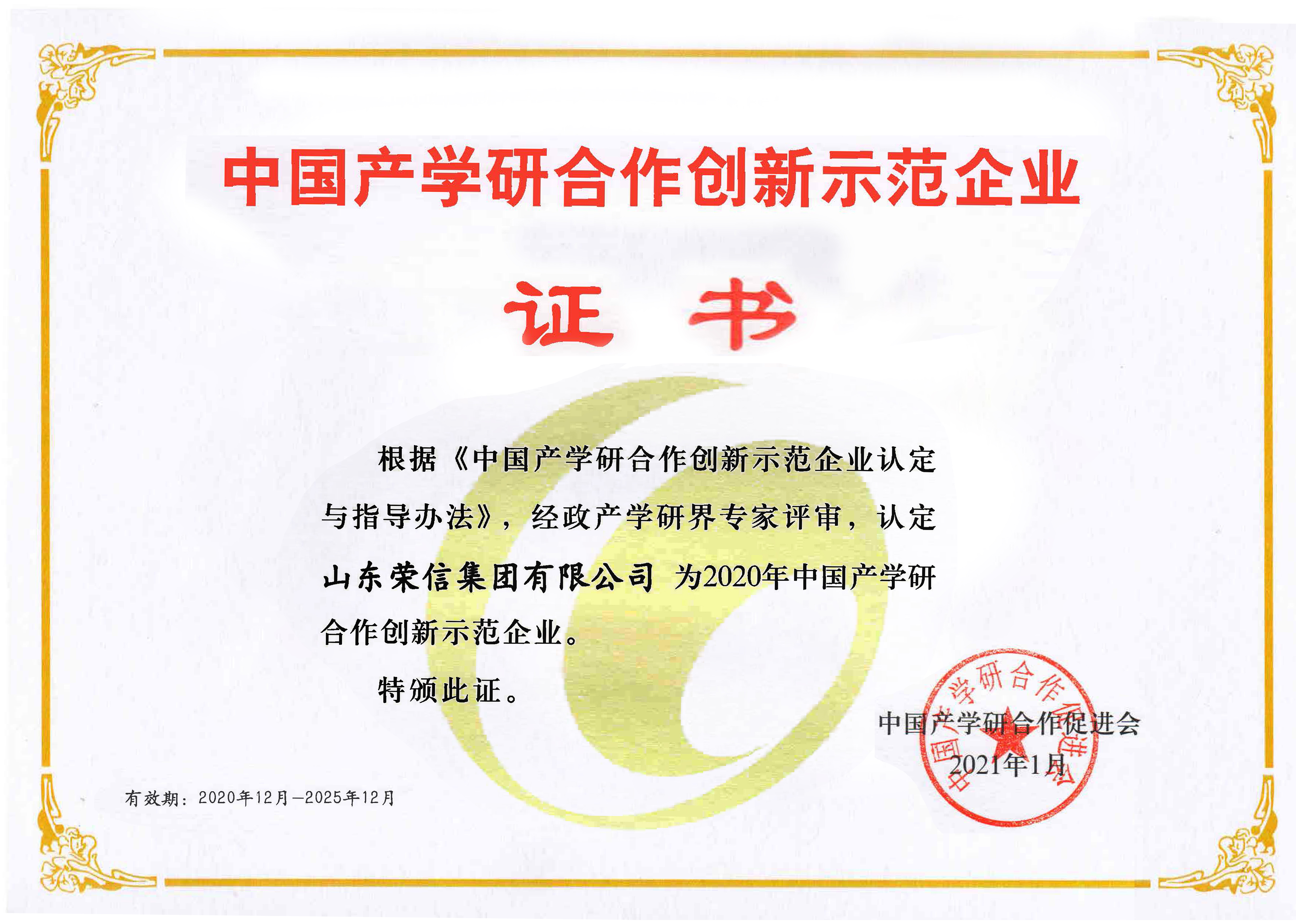2021年中國(guó)產(chǎn)學(xué)研合作創(chuàng)新示范企業(yè)-榮信集團(tuán)證書(shū)