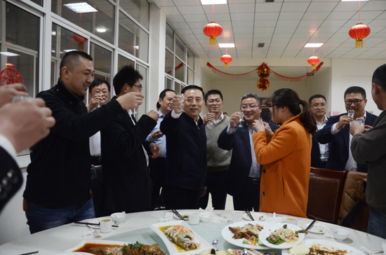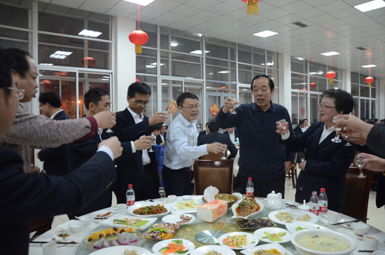 隨后王謹(jǐn)董事長(zhǎng)致祝酒詞,王董事長(zhǎng)首先代表公司董事會(huì),向一直以來(lái)信任和支持榮信煤化的各級(jí)領(lǐng)導(dǎo)和朋友們,向與公司一道奮勇攀登的同事及家屬,致以新春的祝福和崇高的敬意。王董事長(zhǎng)指出,2015年,是榮信煤化奮力攀登的一年,是挑戰(zhàn)極限的一年。在這不尋常的一年中,我們奮力拼搏,披荊斬棘。我們?cè)陧频Z前行中做到了同行業(yè)最好水平,黨委政府、股東單位、社會(huì)各界為我們點(diǎn)贊!當(dāng)2015年漸行漸遠(yuǎn),回望一年來(lái)走過(guò)的路、越過(guò)的坎,才驀然發(fā)現(xiàn),身后的崎嶇,在不知不覺(jué)中已抬升了我們的高度。