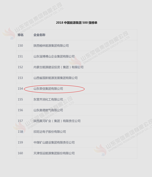 近日,“2018中國(guó)能源集團(tuán)500強(qiáng)”榜單發(fā)布,山東榮信集團(tuán)有限公司榜上有名,位列第154名,比去年上升14位。