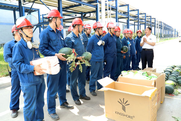 活動中,公司相關(guān)領(lǐng)導(dǎo)詳細(xì)詢問了防暑降溫工作情況,叮囑大家要提高自我保護意識,采取有效措施,預(yù)防中暑突發(fā)事件發(fā)生。并將茶葉、毛巾、西瓜、雪糕等慰問品親自發(fā)放到他們手中,溫暖著每一名職工的心,為高溫下恪盡職守的廣大職工增添了絲絲清涼,極大地調(diào)動了大家的工作積極性。