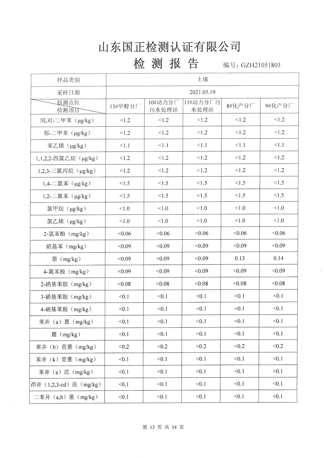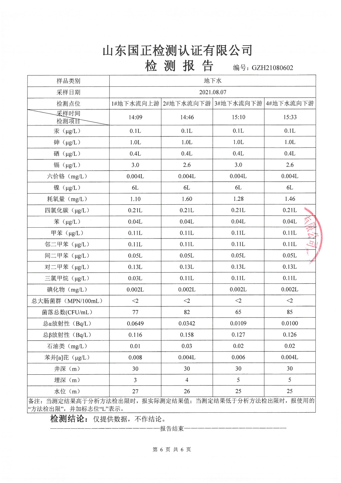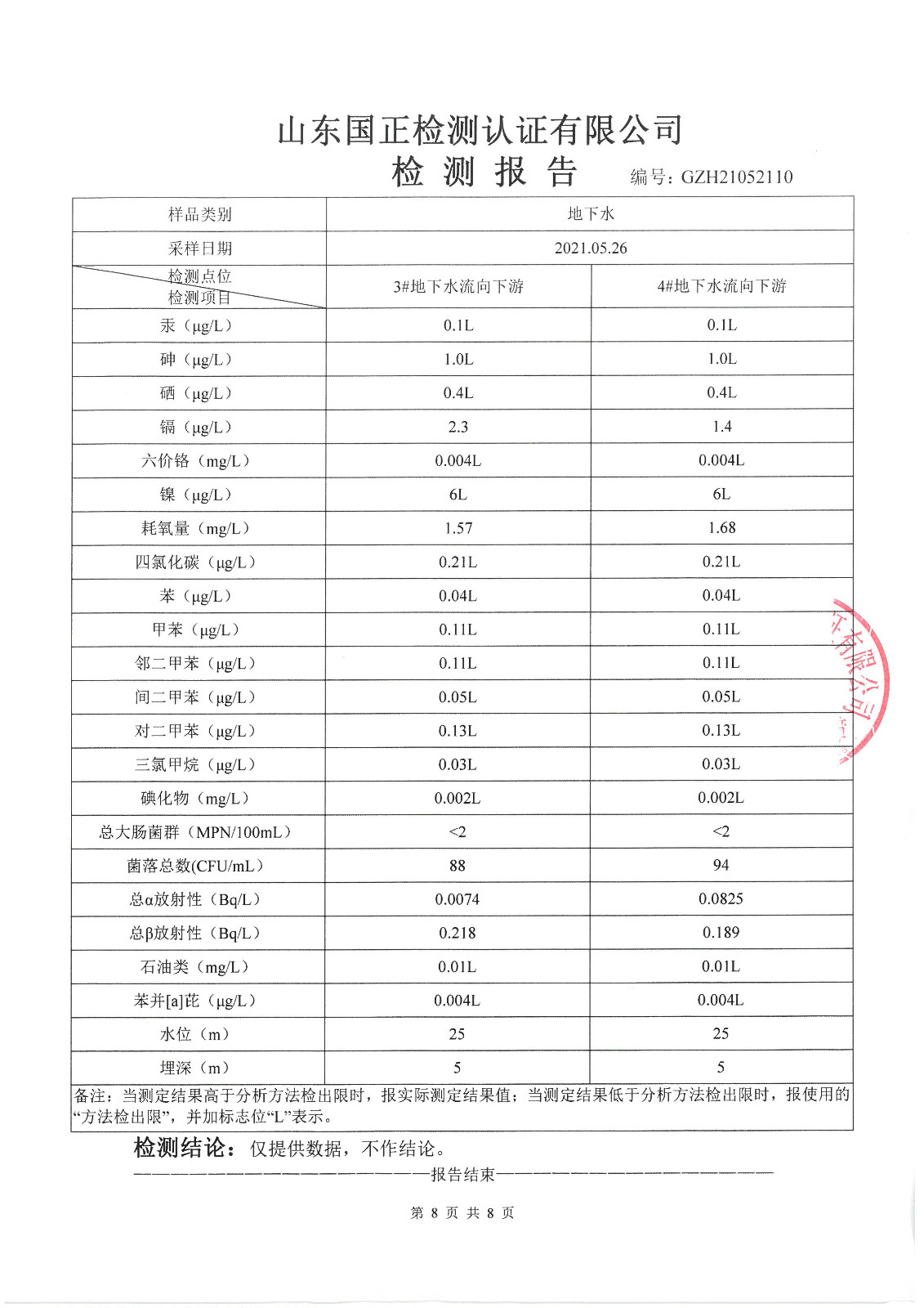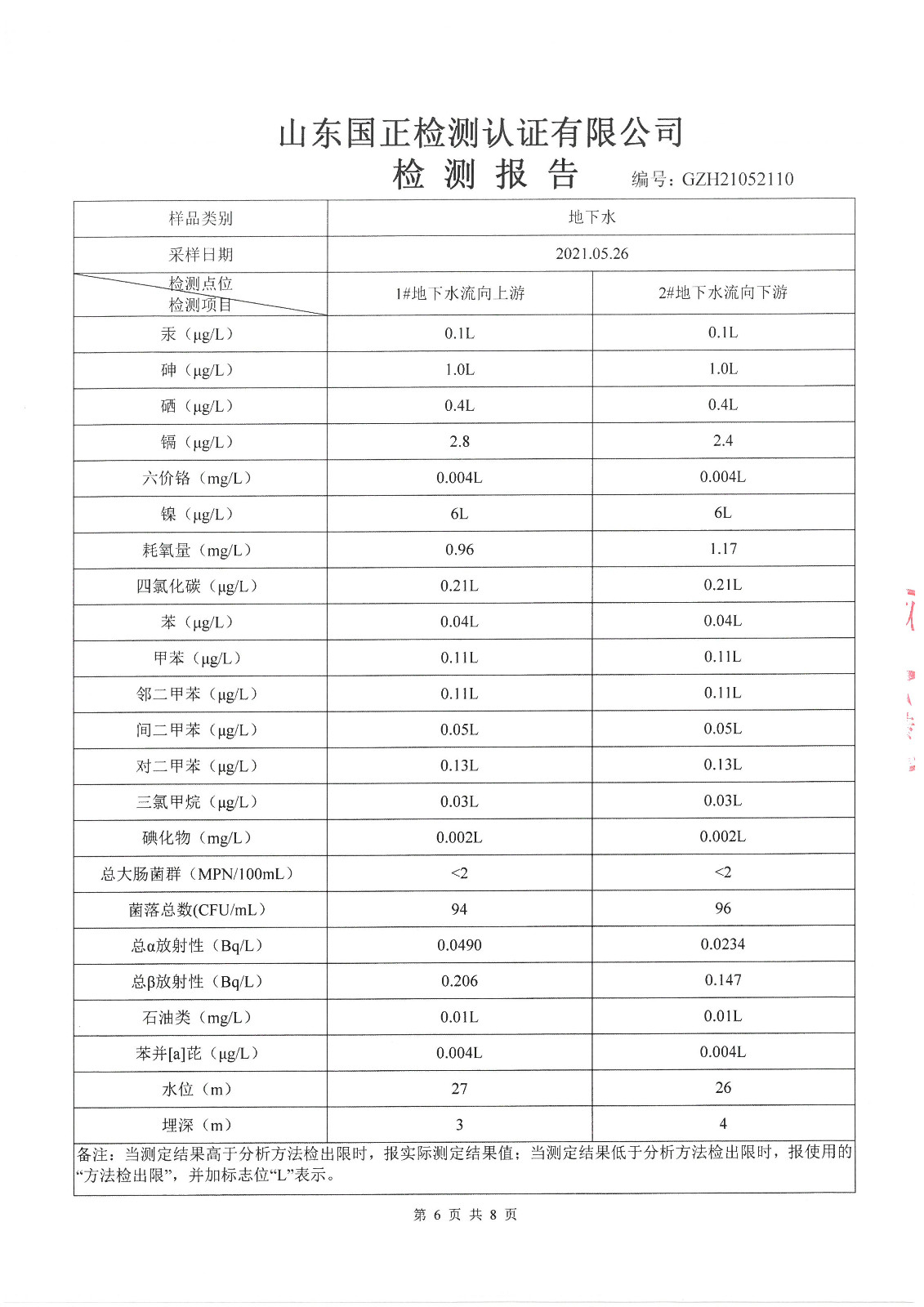 2021年5月、8月份,我公司委托山東國(guó)正檢測(cè)認(rèn)證有限公司依據(jù)《土壤及地下水自行監(jiān)測(cè)方案》進(jìn)行了一次土壤及兩次地下水(枯水期、豐水期各一次)現(xiàn)場(chǎng)采樣,目前對(duì)方已出具了監(jiān)測(cè)報(bào)告,現(xiàn)將監(jiān)測(cè)結(jié)果公告如下(見(jiàn)附件):